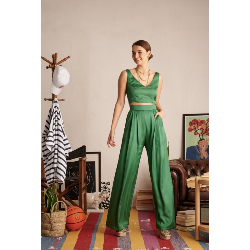 -Αμάνικο crop top -Μονόχρωμο φωτεινό πράσινο -Κλείσιμο με κρυφό φερμουάρ στο πλάι -V-neck μ..