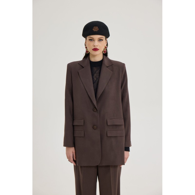 Σακάκι long fit Μονόχρωμο καφέ Κέντημα τριαντάφυλλο στο μανίκι σε μαύρο χρώμα Κλείσιμο με κουμ..