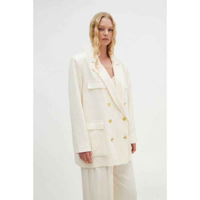 Oversized σακάκι Κλείσιμο με χρυσά κουμπιά Pattern με πορτοκαλί ρίγες και μπεζ βάση Inspiratio..
