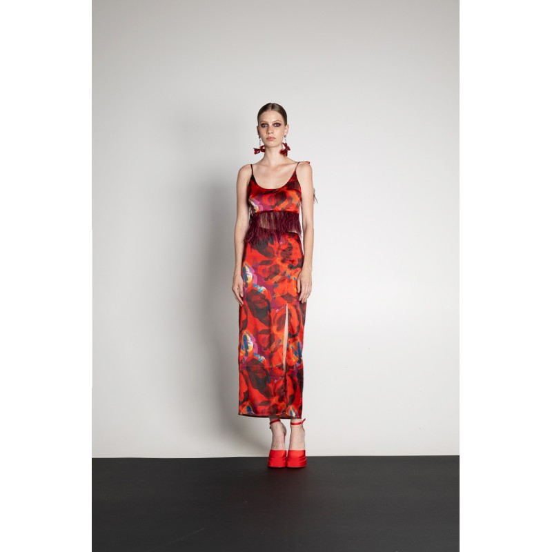 48% Rec Pol 52% Conv Pol Side Split Skirt Red Floral Handwash / Dry Clean According To I..